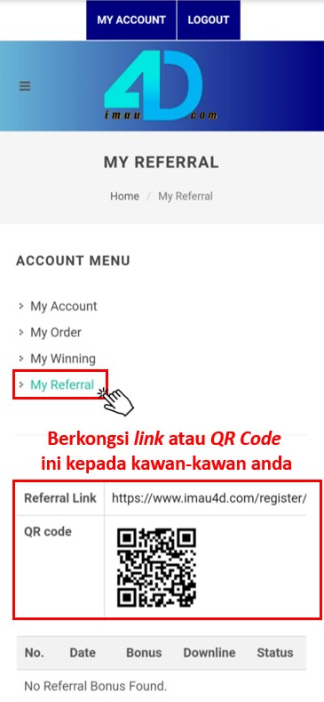 - Lepas done log in, tekan 'My Referral' untuk dapatkan link atau QR Code.